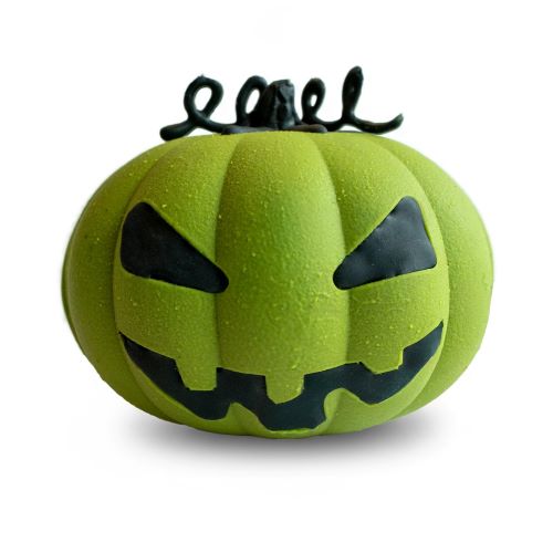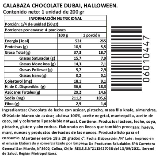 La Calabaza Monster Pumpkin Dubai Edition Tremus es una pieza de chocolatería artesanal, pintada a mano. Su exterior de chocolate de leche envuelve un relleno “Dubai”, una mezcla cremosa de pasta de pistachos y knafe tostado.