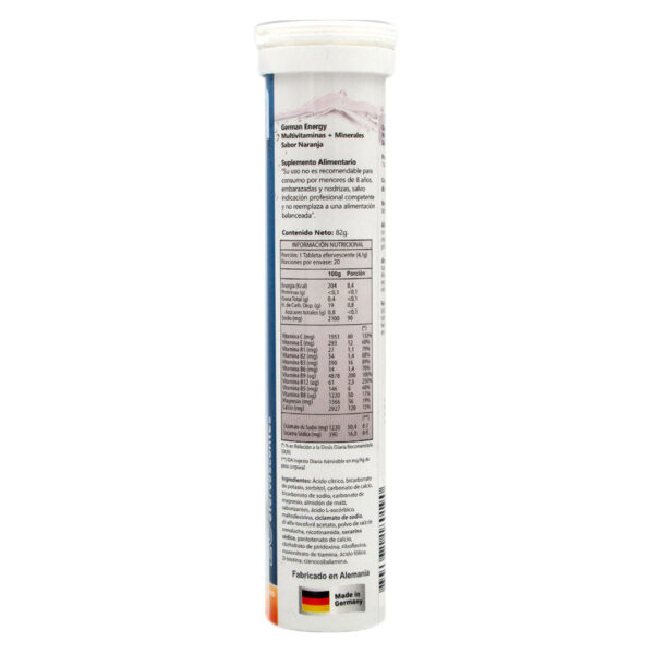 Multi Vtaminas + Minerales Sin Glutamina Sabor Naranja 20 Tabletas efervescentes Marca German Energy