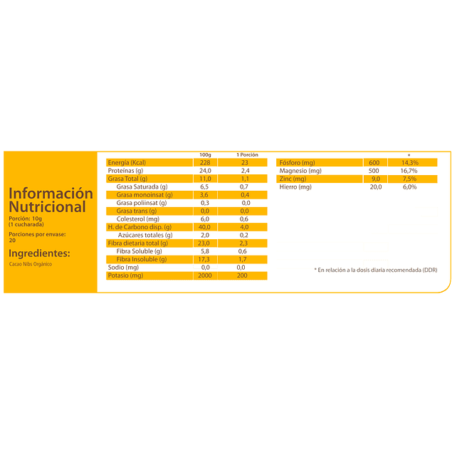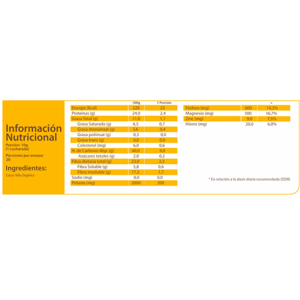 Certified Organic by CERES GmhB CL BIO-005[vc_tta_section title="Información Nutricional" tab_id="1594172823860-40c26baa-cef4"Cacao Nibs 200 g 100% Orgánico