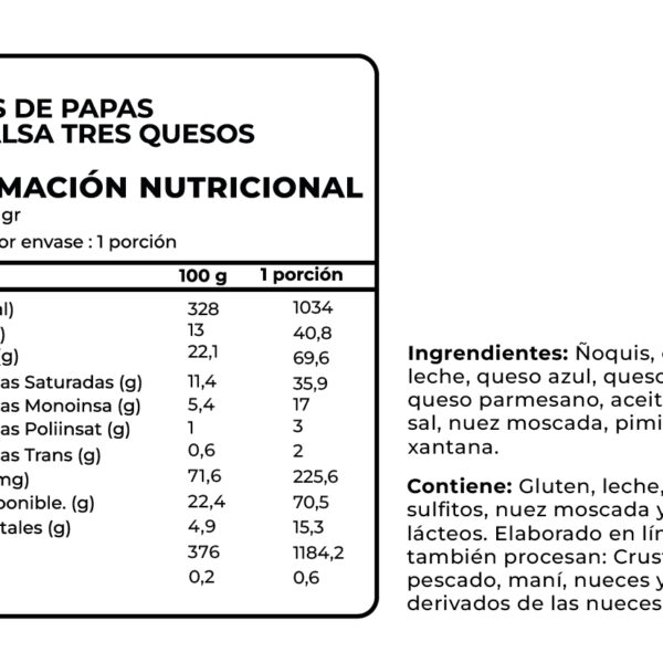 Los Ñoquis de Papas con Salsa Tres Quesos Tremus (315 g) son un plato vegetariano, artesanal y natural que ofrece 40,8 g de proteína por porción. Su combinación de papa suave con una salsa cremosa de parmesano, mozzarella y queso azul entrega sabor, nutrición y el equilibrio perfecto para disfrutar sin culpa.