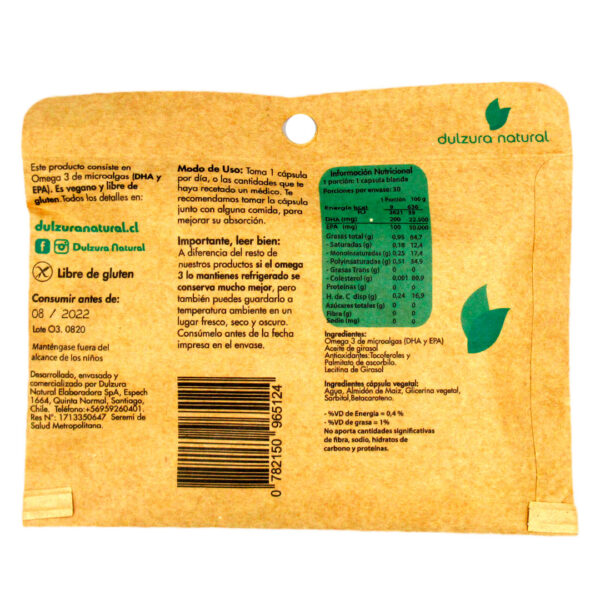 Omega 3 de microalgas Vegano Sin Gluten 30 Capsulas300 mg Marca Dulzura Natural