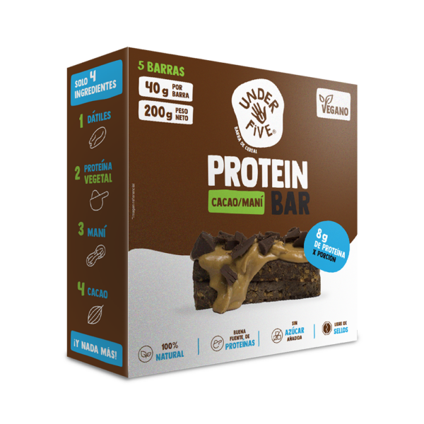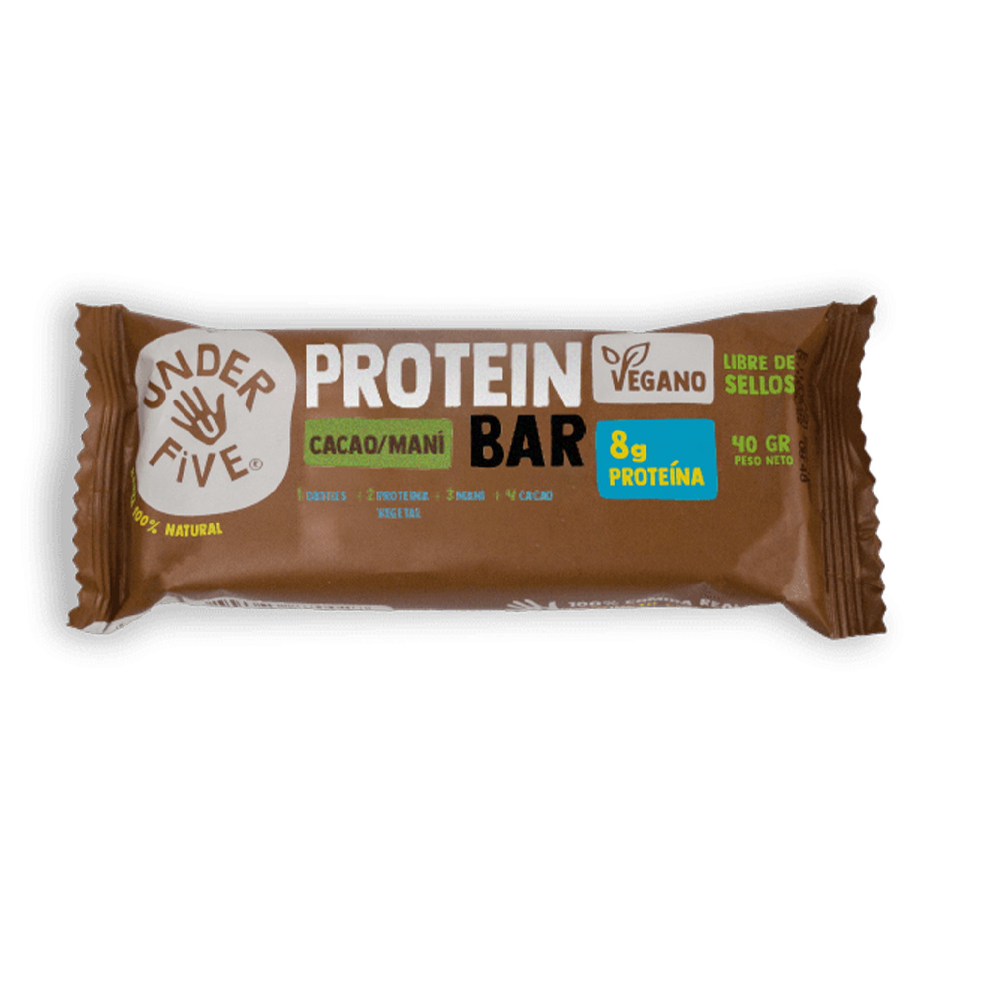 Sólo 4 ingredientes: Dátil, aislado de proteína de soya, maní (14%), cacao (4%)