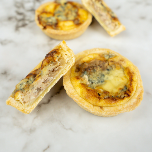 Las Mini Quiches de Pera con Queso Azul Tremus combinan una base de masa artesanal de mantequilla con un relleno cremoso de pera caramelizada, queso azul y nueces tostadas.