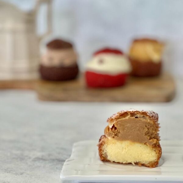 Masa Choux rellena de crema pastelera de vainilla y crema de manjar de elaboración propia.