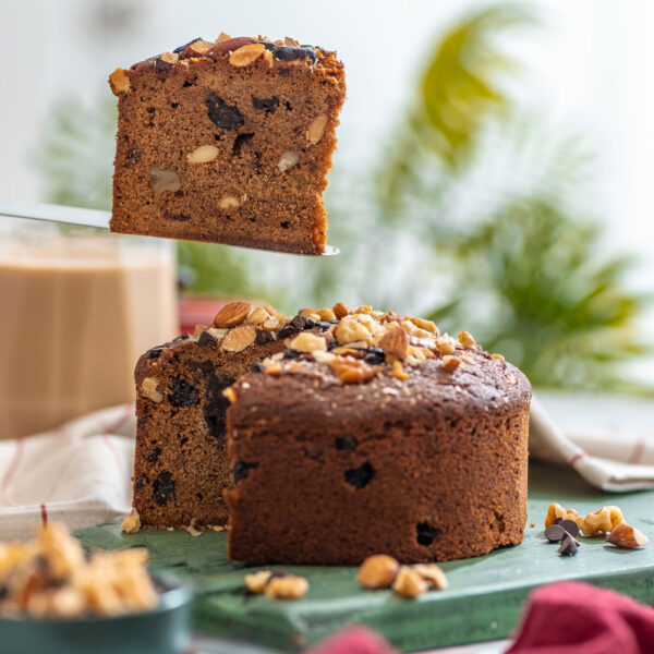 En base a harina de Trigo, endulzado con Panela, con toques de ralladura de naranja, canela, cacao y jengibre. Acompañado con frutos secos, como: almendras y nueces, además de chips de chocolate de 60% de cacao.