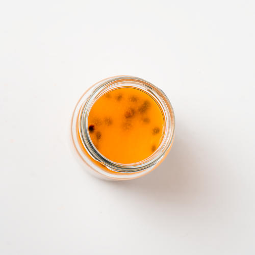 - Salsa de mango y maracuyá natural – elaborada con pulpa de mango, pulpa de maracuyá y alulosa 100%, sin azúcar añadida.