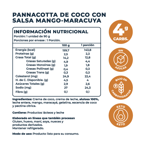 - Pannacotta de coco keto – mezcla cremosa de crema de coco, crema de leche, leche entera y alulosa 100%.