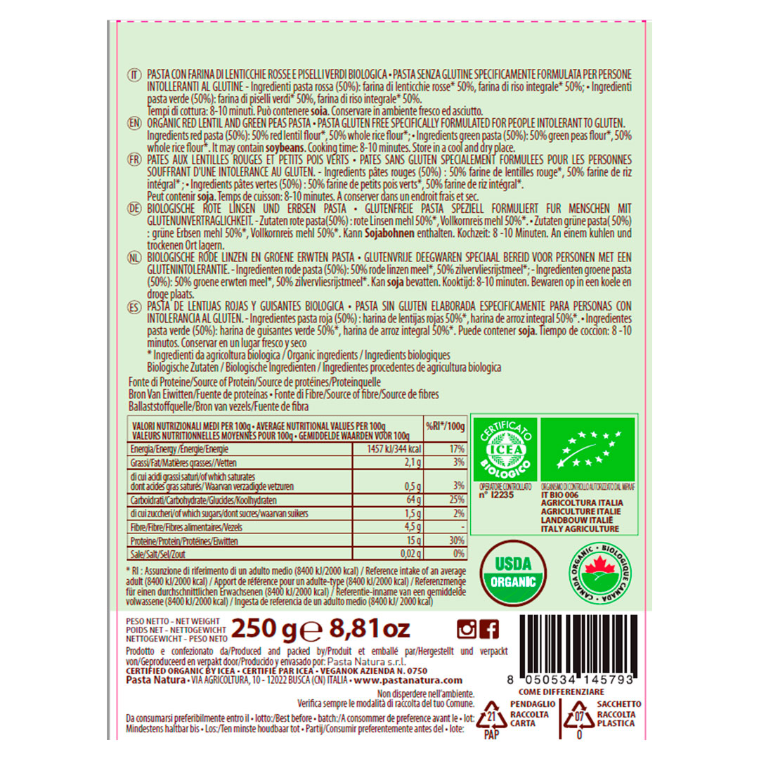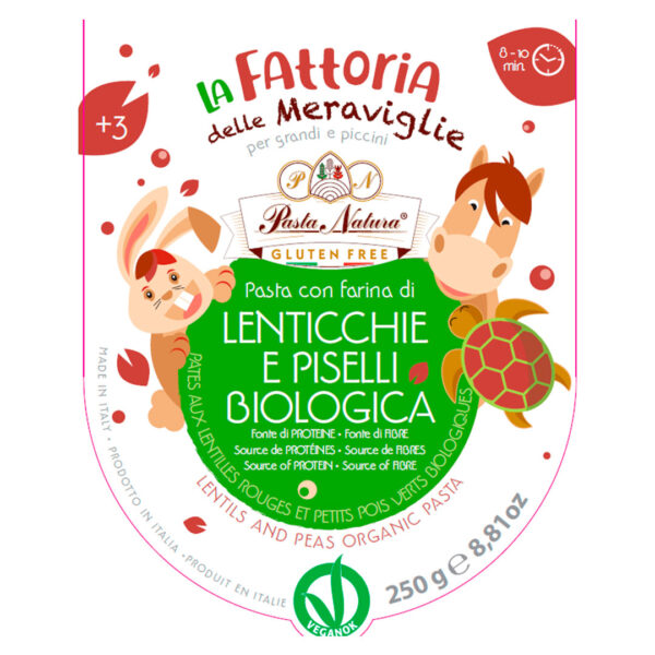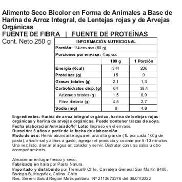 250 grColorida y divertida, la pasta con Forma de Animales, tiene un sabor increíble. Elaborada con harina de lentejas rojas orgánica y harina de arvejas orgánica. Esta pasta es una importante fuente de proteína vegetal. Con sus simpáticos animalitos, hace de cada comida un momento de alegría y de compartir. Comer bien, de forma sana y equilibrada, es una elección a la que ya no podrás renunciar: una vez que pruebes esta pasta, tu familia no querrá comer otra.