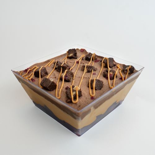 Esta deliciosa creación combina una base de trocitos de brownie de chocolate 60 % sin azúcar añadida, con frambuesas que aporta frescura y un contraste ácido natural. Sobre esta base se incorpora una suave crema de manjar sin azúcar añadida, cremosa y envolvente, que se complementa con un mousse de chocolate 60 %, ligero y profundo en sabor.