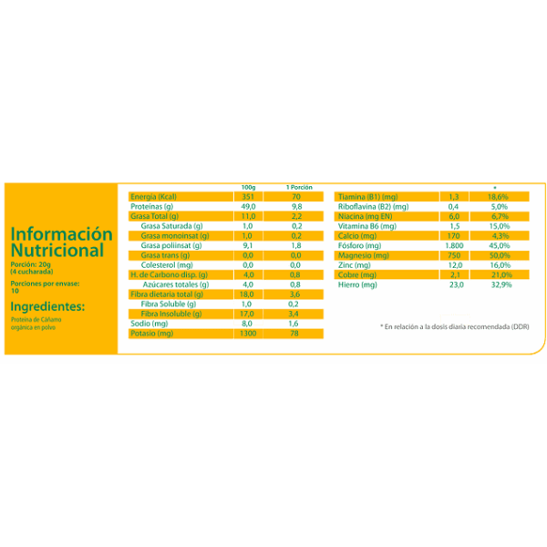 Hemp Protein es una de las mejores fuentes de proteína vegetal, con un completo perfil de aminoácidos y excelente asimilación, puede ser usado como la principal fuente de proteínas en la dieta. Además es muy rico en minerales y vitaminas, donde destaca su aporte de hierro, fósforo y magnesio, entre otros.