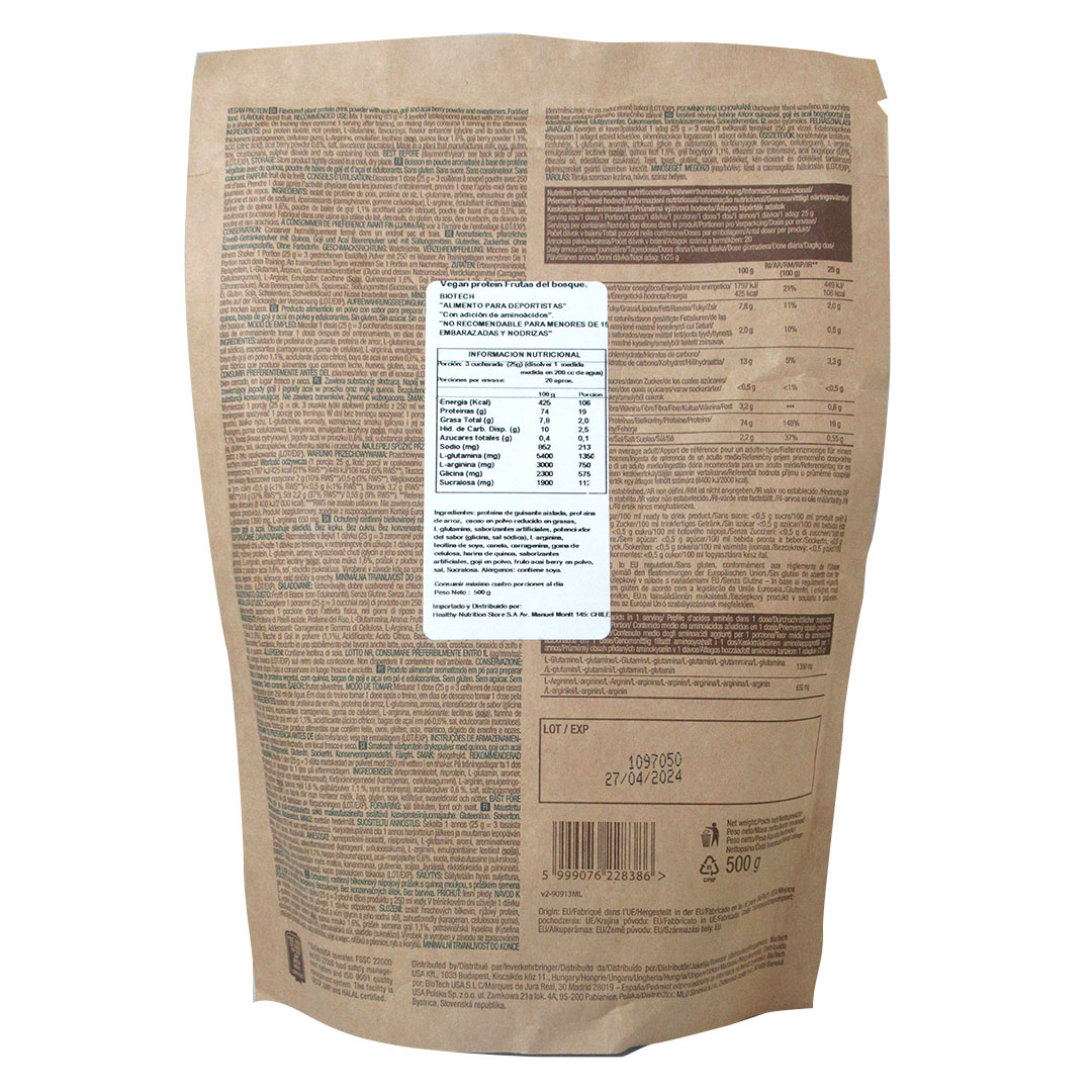 Proteína Vegana en PolvoL-Glutamina L-Arginina Sabor Frutos del Bosque 500grs Marca Biotech USA.
