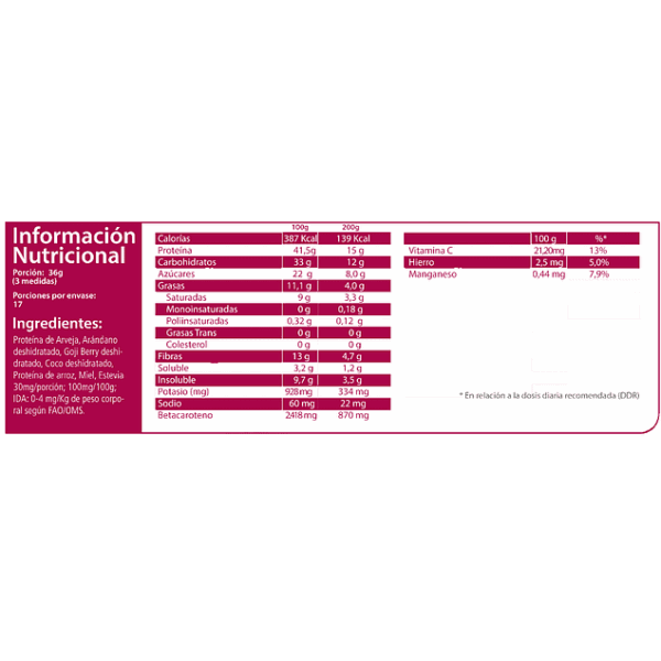 VeggiPro Berries es un delicioso batido protéico de Superalimentos, que complementará tu dieta para alcanzar tus objetivos de salud y estado físico, gracias a su alto valor biológico, al combinar dos proteínas vegetales (Arveja y Arroz) con Superalimentos como Arándano, Coco y el milenario Goji berry con su poder antioxidante y su riqueza en vitaminas, entregándote el máximo de nutrición y sabor natural.