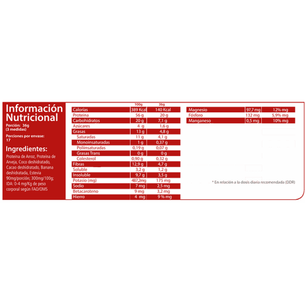 VeggiPro Chocolate está formulada con Coco deshidratado, Cacao natural y endulzante, sin incorporar ingredientes químicos, para ser un producto natural y puro.