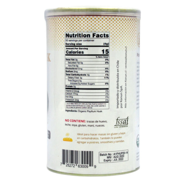 Psyllium Husk, Keto, Sin GMO, Vegano, Sin gluten, Organico, 200 grs, Marca Konun