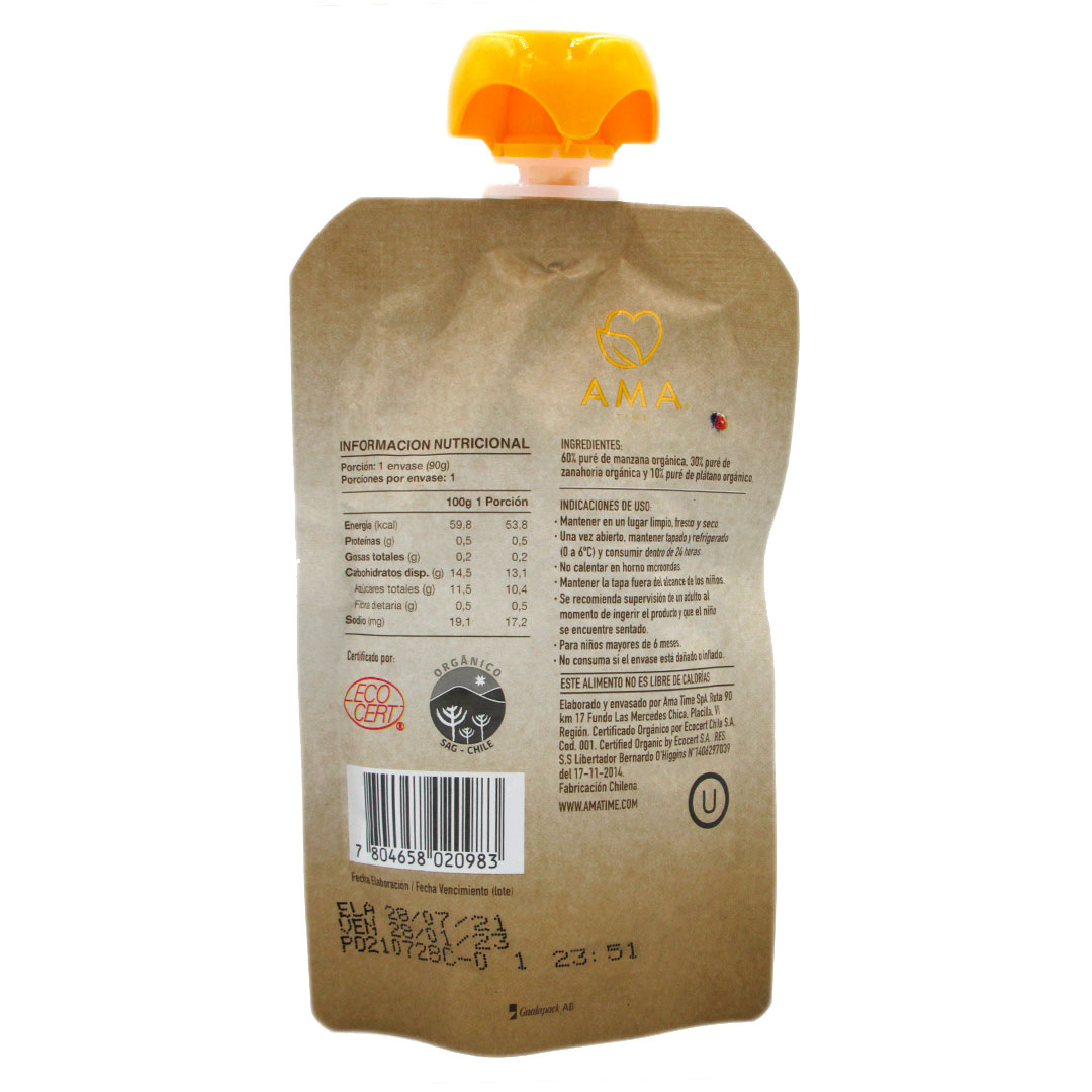 Pure de Fruta Organico Sabor Manzana Platano y Zanahoria 90 gr marca AMA
