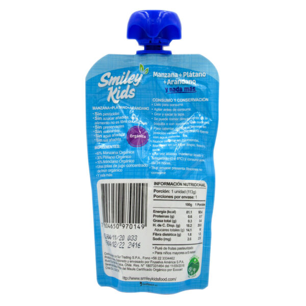 113 GrsSmiley Kids es 100% orgánico, libre de pesticidas, sin colorantes, preservantes ni saborizantes. No tiene agua ni azúcar añadida y es 100% Gluten Free