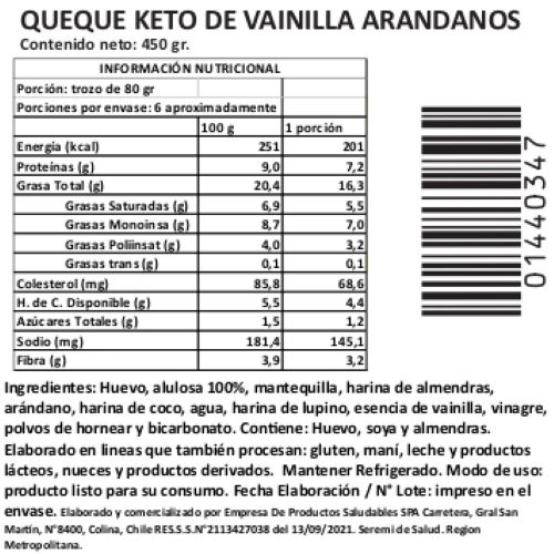 Elaborado con harina de coco, lupino y almendras, este queque artesanal aporta fibra natural y 7 g de proteína por porción, con solo 4,2 g de carbohidratos. Su textura esponjosa y su aroma a vainilla se combinan con arándanos, que aportan un toque frutal fresco y antioxidante.