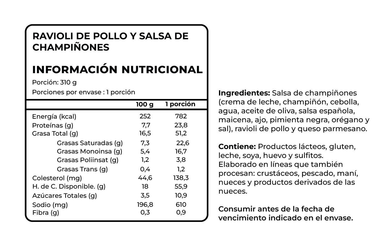 El Ravioli de Pollo con Salsa de Champiñones Tremus es un plato gourmet artesanal, alto en proteínas (23,8 g por porción), elaborado con pollo, champiñones frescos, crema y parmesano. Una opción deliciosa, nutritiva y natural para disfrutar de un almuerzo equilibrado con el sello de calidad Tremus.