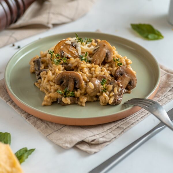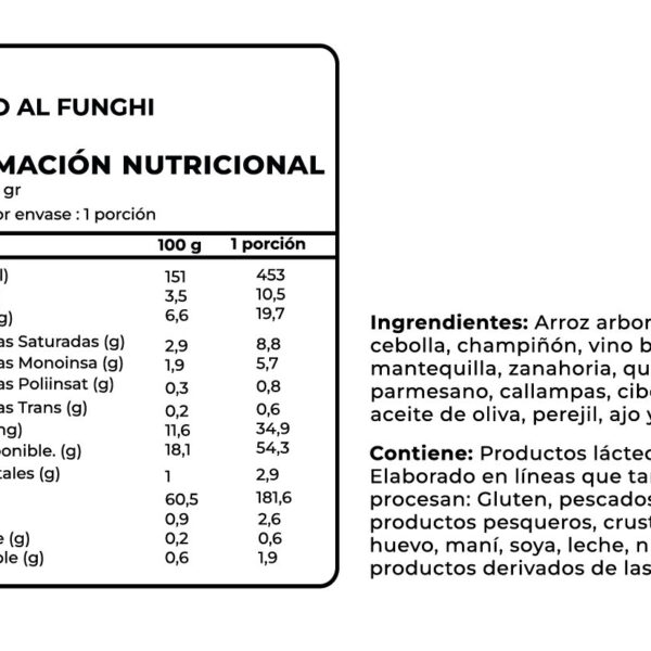 Nuestro risotto realza el sabor profundo de los hongos en una cocción lenta y cremosa junto al arroz arborio, perfumada con vino blanco, hierbas frescas y un final mantecoso con queso parmesano. Una porción completa y reconfortante, con 10,5 g de proteína y buena fuente de fibra gracias a los vegetales y a la variedad de hongos.