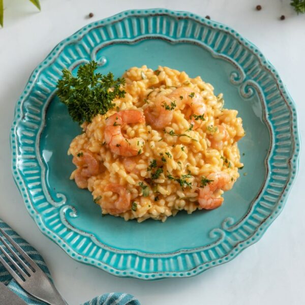 Disfruta de una experiencia gourmet en casa con un risotto de camarones que te hará destacar.