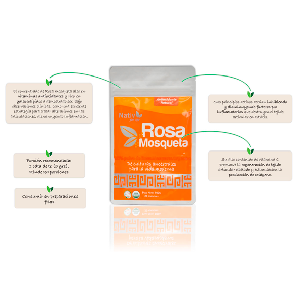 El concentrado de Rosa Mosqueta es rico en vitaminas antioxidantes y contiene galactolípidos, el cual ha demostrado ser, bajo observaciones clínicas, excelente para el tratamiento de enfermedades asociadas a las articulaciones, disminuyendo inflamación.