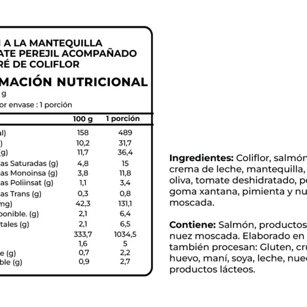 El salmón fresco, sazonado con sal, pimienta negra y finas hierbas, se acompaña de un puré de coliflor cremoso, elaborado con crema bechamel y aceite de oliva, logrando una textura suave y un sabor delicado.