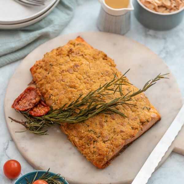 Filete de Salmón Salar al horno elaborado en base a una Costra de Almendras, especiado con Anís Estrellado, Tomillo y Lima
