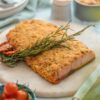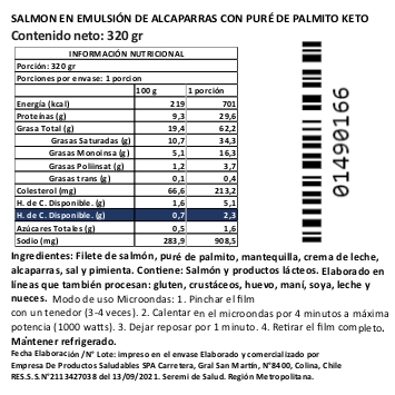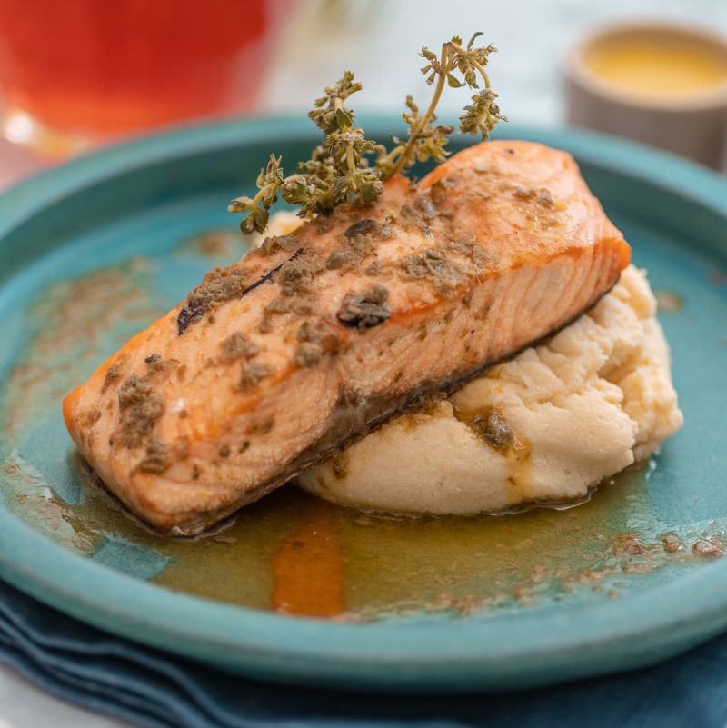 Salmón preparado en emulsión de alcaparras, acompañado de Puré Keto en base a palmitos.
