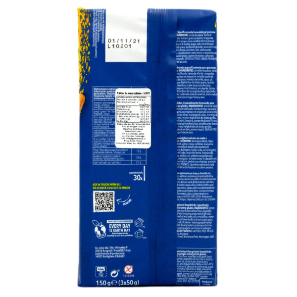 Ingredientes principales: almidón de patata , harina de arroz , almidón de maíz modificado , harina de alforfón , margarina vegetal [aceites y grasas vegetales en proporción variable (aceite de girasol alto oléico, manteca de cacao, manteca de karité), agua, sal, emulgentes: monoglicéridos y diglicéridos de ácidos grasos, lecitina de girasol; zumo de limón , levadura , jarebe de glucosafructosa , azúcar , sal , espesante: hidroxipropilmetilcelulosa ; emulgente: ésteres monoacetil y diacetil tartárico de los mono- y diglicéridos de los ácidos Grasos ; gasificantes: carbonato ácido de amonio, carbonato ácido de sodio ; aroma natural . SIN LACTOSA. SIN TRIGO.