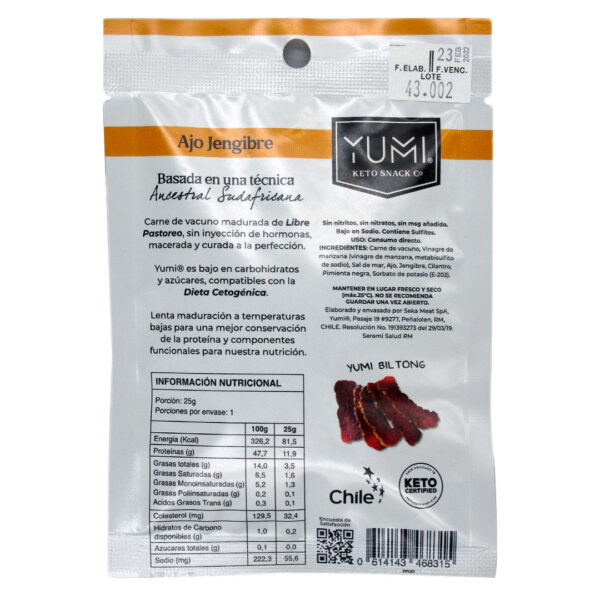 Snack Keto de Carne de Vacuno Sabor Ajo Jengibre y Pimienta 25 grs marca Yumi Yumi