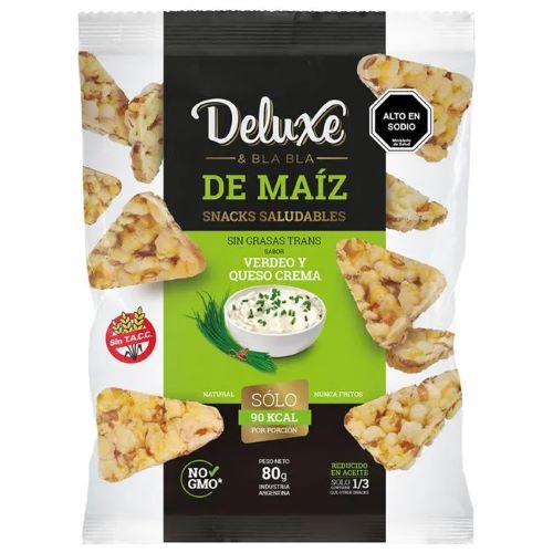 Snacks de Maiz Libre de Gluten sin TACC Verdeo Queso Crema 80 gr Marca Deluxe & Bla Bla