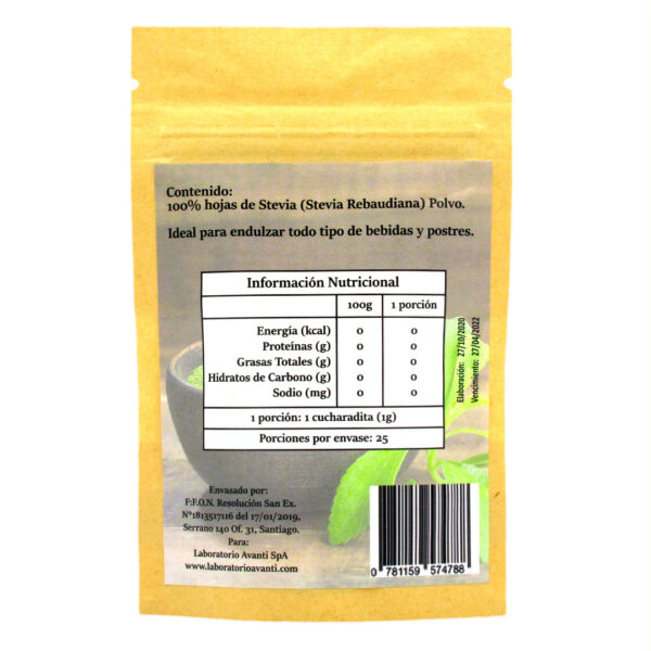 100% Hojas de Stevia Rebaudiana pulverizadas.