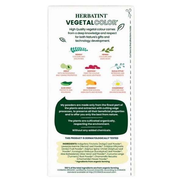 Herbatint Vegetal Color es un producto de acción dual, tinte y cuidado para el cabello, 100 % natural y orgánico ,que combina hierbas para teñir de alta calidad con el poder de los antiguos polvos de hojas ayurvédicas.