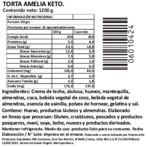 Torta Amelia Tres Leches keto sin azúcar añadida, con bizcocho de almendra, remojo de leche de almendra, manjar artesanal y cobertura de merengue. Solo 2,9 g de hidratos de carbono por porción. Unidad de 1200 gr.