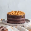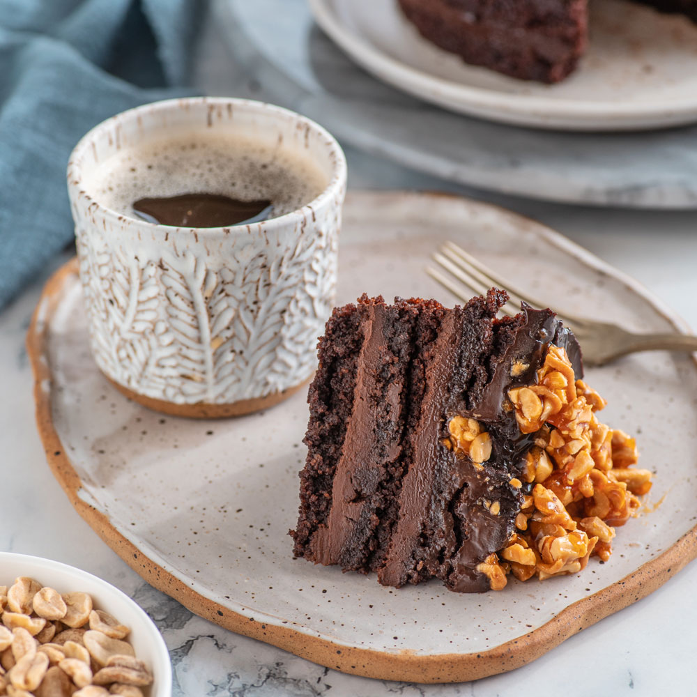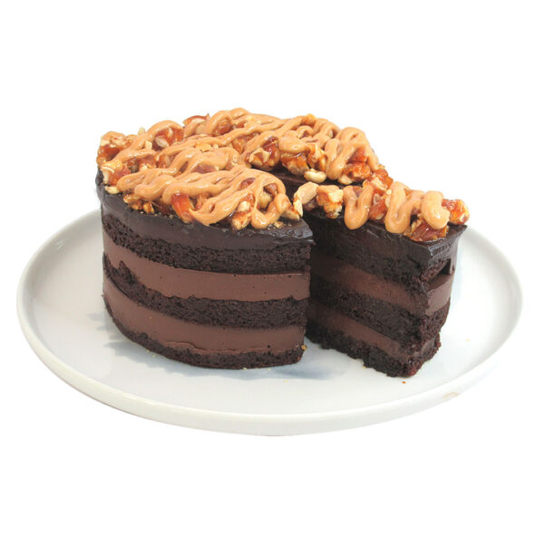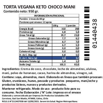 Este bizcocho está relleno con ganache de chocolate al 60% y praliné de maní artesanal. Elaborado sin azúcar y endulzado con alulosa, es una opción vegana y artesanal, sin ingredientes de origen animal. Las porciones están ajustadas según las recomendaciones nutricionales de la dieta Keto.