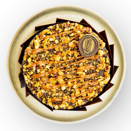 Relleno con ganache de chocolate al 60% y praliné de avellanas artesanal, este bizcocho es endulzado con alulosa, apto para dieta keto y vegano. Elaborado artesanalmente, su diámetro referencial es de 14 cm.