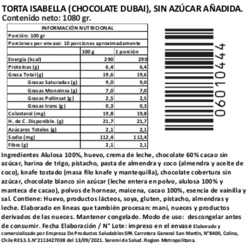 Torta Isabella (Chocolate Dubai), Sin Azúcar Añadida, 1080 g, Tremus