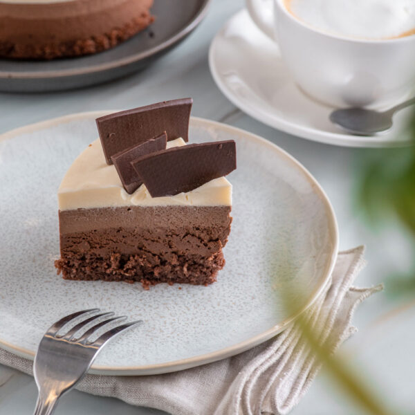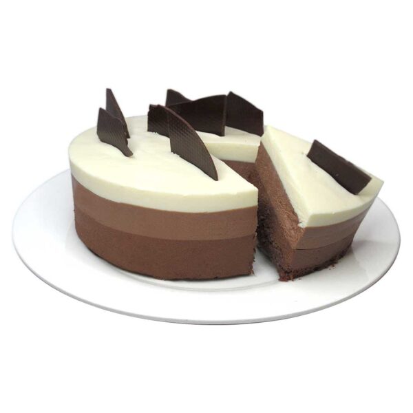 Disfruta de nuestra Torta Mousse Tricolor, un deleite de chocolate 85% cacao.