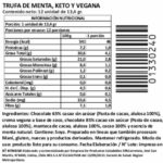 Trufas keto y veganas sin azúcar, con sabor a menta. Elaboradas con chocolate 60 %, manteca de cacao y crema vegetal. Solo 0,6 g de carbohidratos por porción. Pack de 12 unidades. Total de 160 g.