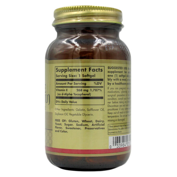 Vitamina E natural no sintética. Es muy dificil encontrar solo d-alfa tocoferol que es la vitamina E natural. Solgar es mi marca favorita de muchos años, lo mejor para evitar la formacion de masas en los senos. Delivery super rapido, me encanta tremus.