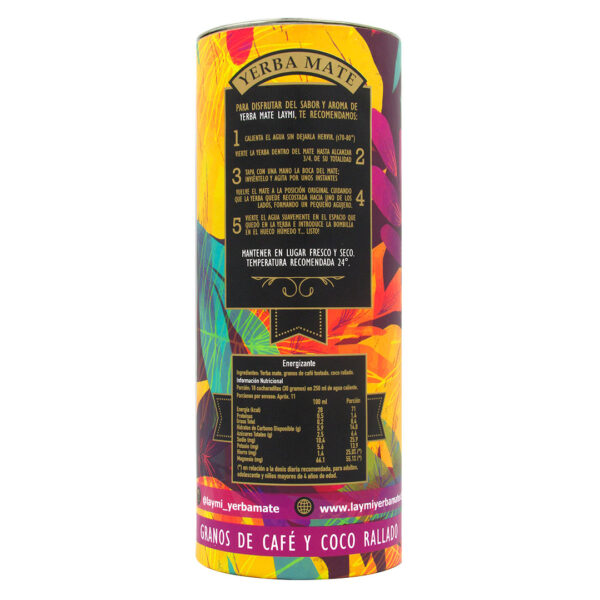 Yerba Mate Energizante sabor Granos de Cafe y Coco Rallado con stevia 330 Grs Marca LAYMI